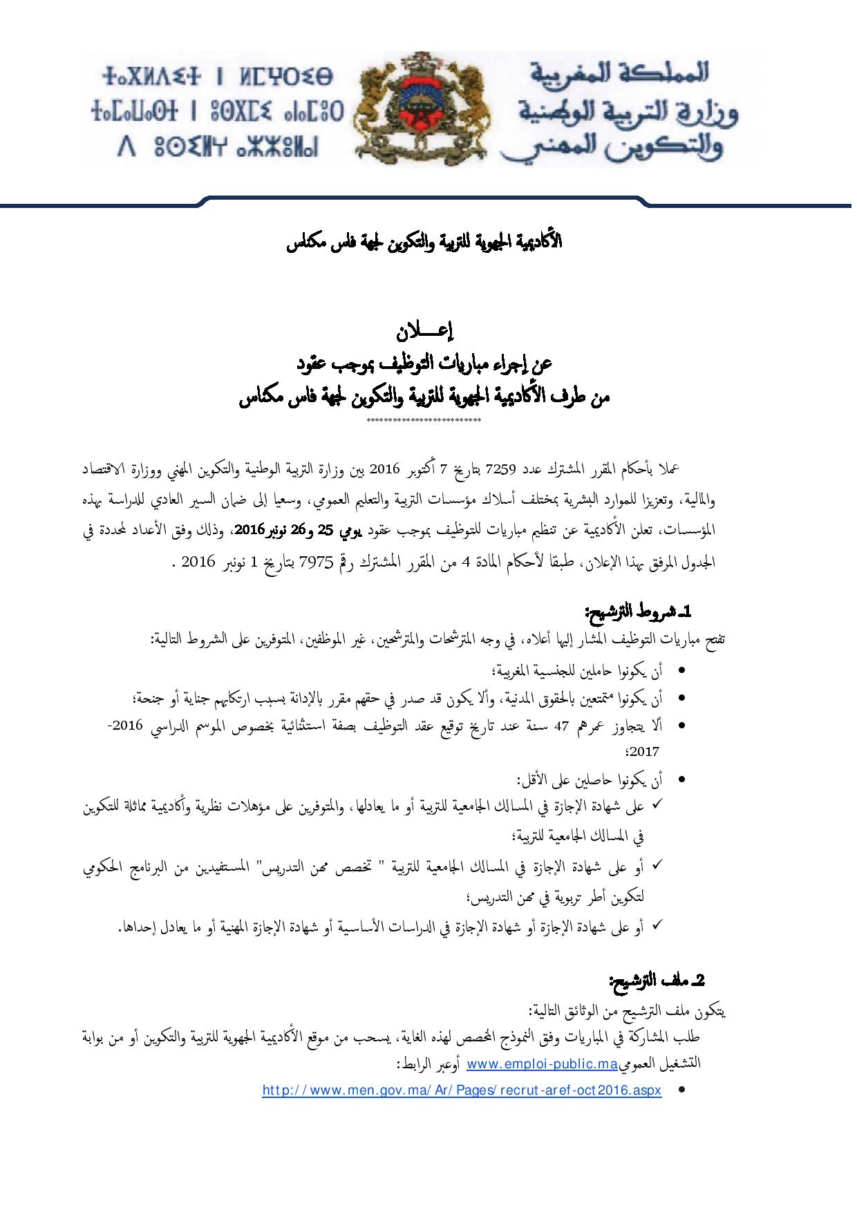 Ouvrir la porte aux candidatures formelles de recrutement de cadres pour les écoles régionales denseignement et de formation. 25 شتنبر 2020 إعلانات - تعيين الاساتذة المبرزين والاساتذة الذين لم يجتازوا بنجاح سلك التبريز برسم سنة 2020. Associations des parents et des tuteurs délèvesUne rencontre de communication a été organisée jeudi à Fès dans le cadre de la célébration de la journée nationale des associations.